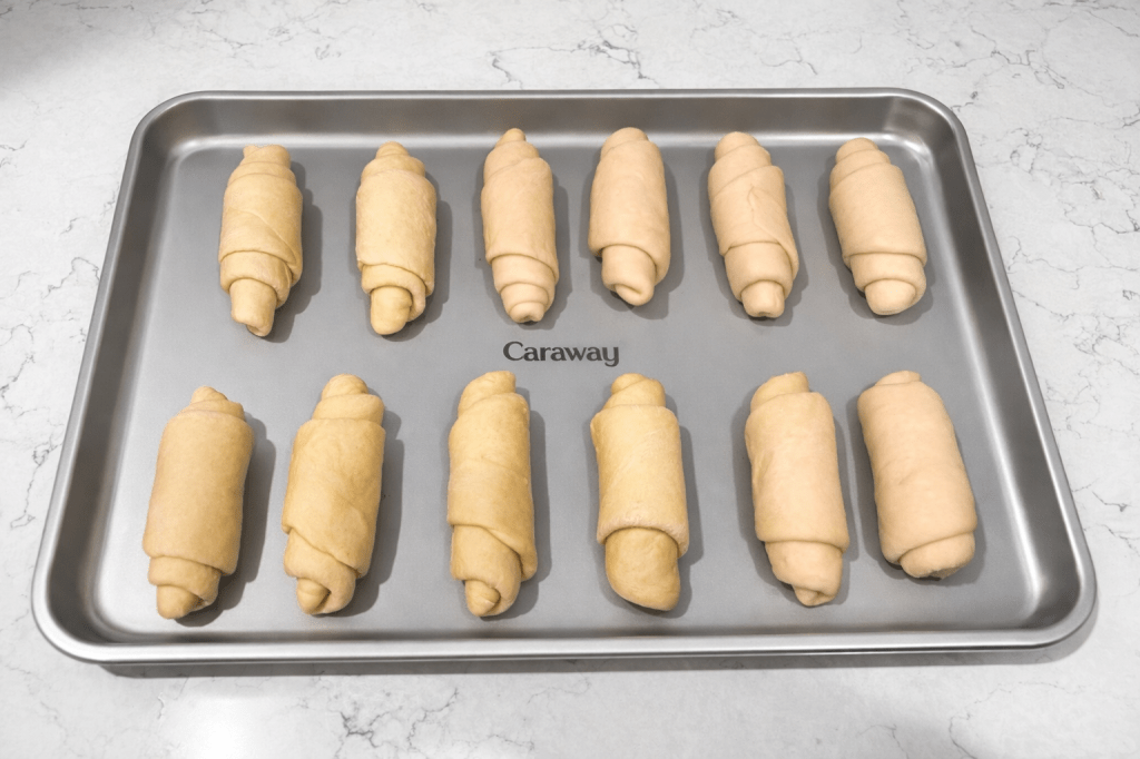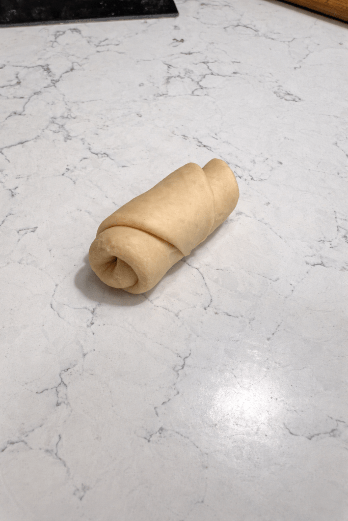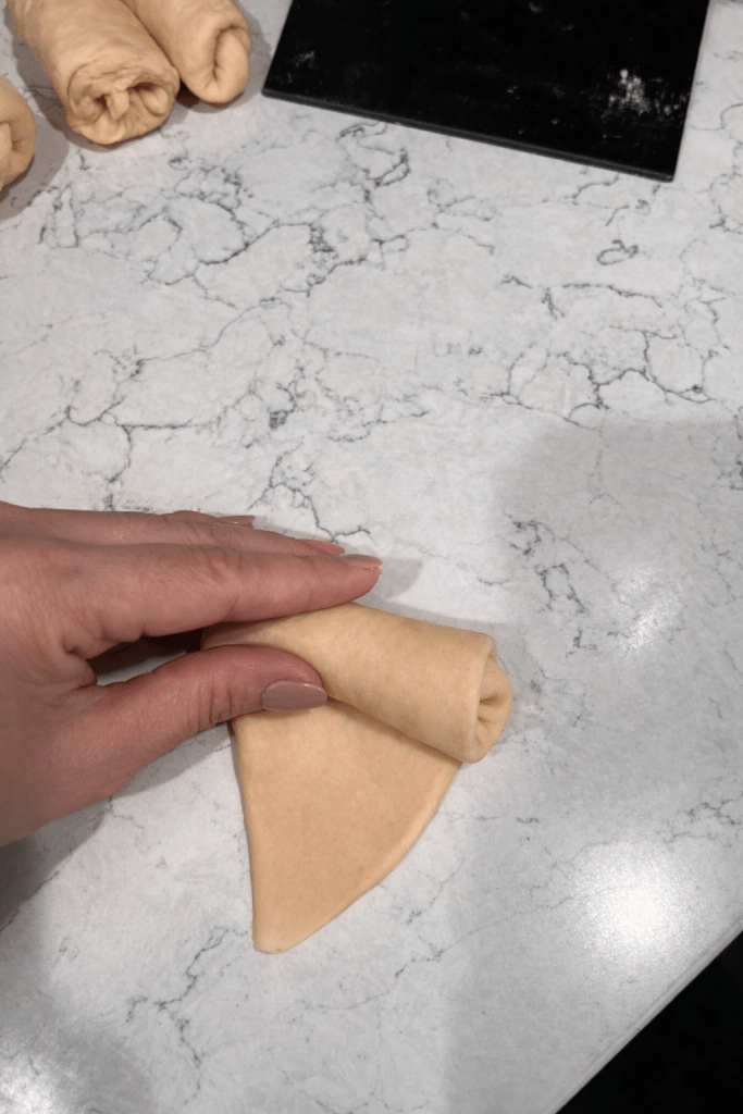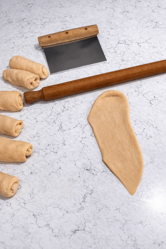 Divide the dough into 12 equal pieces Roll each piece into a rope about 4 inches long. Let rest a few minutes (this makes shaping easier). Roll each into a triangle shape. Roll up into a crescent (croissant-style) shape.